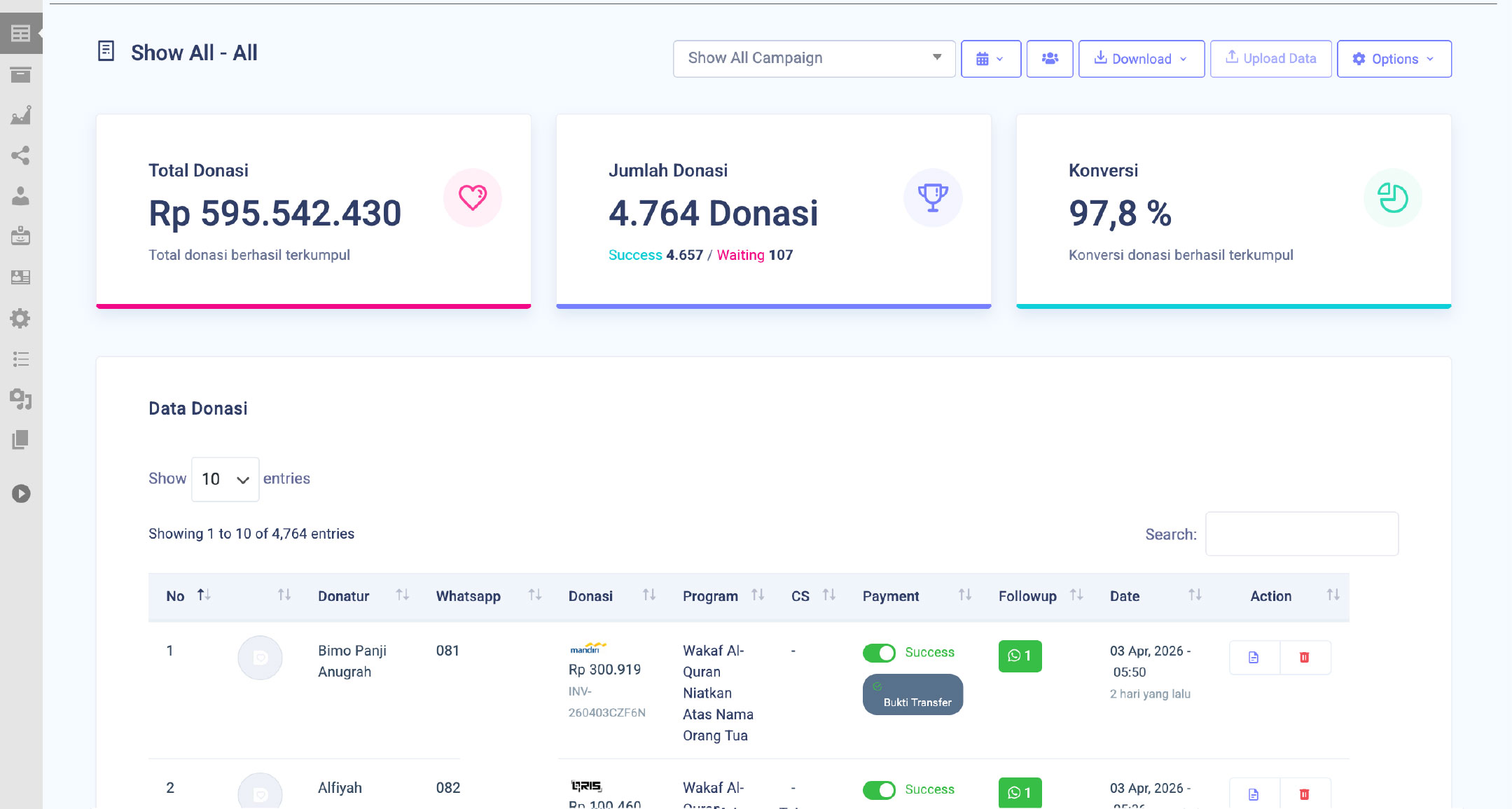 Unduh data donasi dalam format Excel atau CSV lengkap dengan informasi donatur, nominal, dan transaksi. Selain itu, data dapat digunakan untuk analisis dan laporan fundraising. Dengan demikian, yayasan dapat mengambil keputusan berbasis data secara lebih tepat dan strategis.